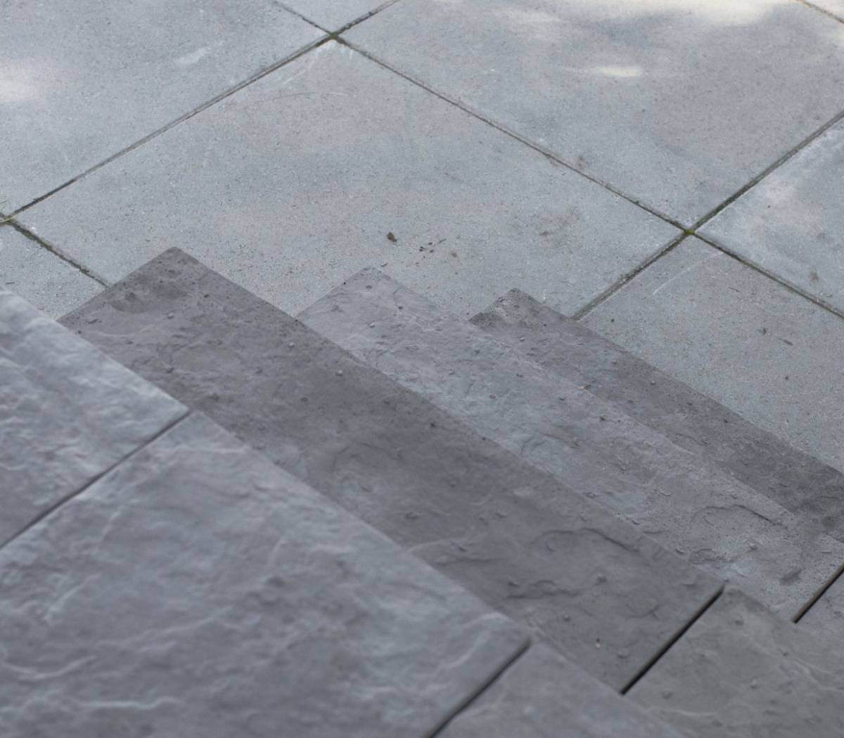 La marche Ardoise vient s'agencer avec les dalles Ardoise, une dalle très populaire auprès de la clientèle. La marche Ardoise imite les dalles Ardoise avec son fini texture ardoisé, à une fraction du prix.