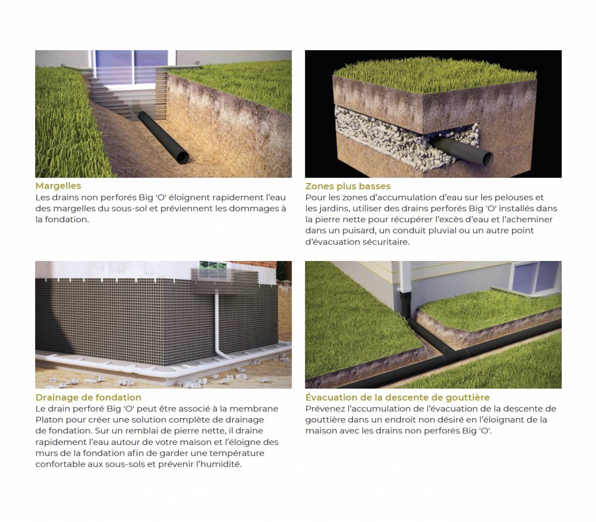 Un drain français est un tuyau en polyéthylène posé au pied des fondations d'un bâtiment pour évacuer le surplus d'eau du sol. Il peut être connecté au système pluvial de la municipalité, ou à un bassin de pompage.