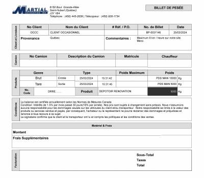 Sur le billet de pesée, nous avons besoin de savoir : - Nom du client - Nom du transporteur - Coordonnées du client - Coordonnées du transporteur - Numéro de plaque du véhicule - Nature du matériel décharger - Lieu de la provenance - TERRE : ADRESSE COMPLÈTE